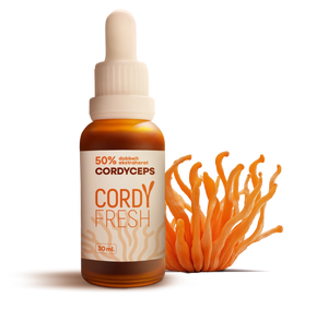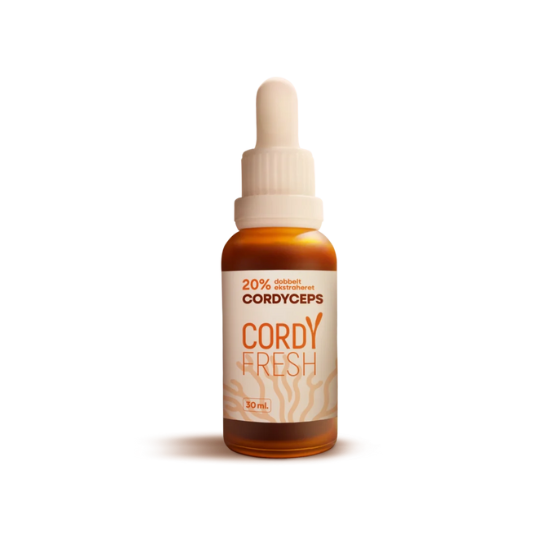 Cordyceps er et kvalitetsprodukt fra Cordyfresh, fremstillet i Aarhus med fokus på lokal og gennemsigtig produktion. Ekstraktet er udvundet af økologisk dyrket Cordyceps militaris og produceret af både frugtlegeme og mycelium for at sikre et bredt spektrum af bioaktive stoffer.